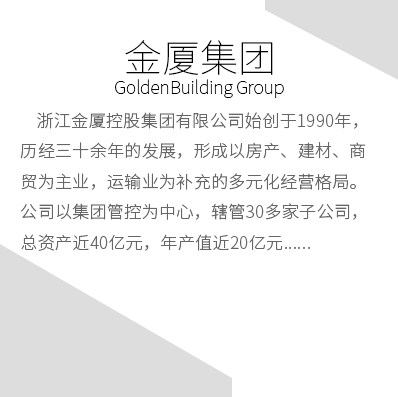 浙江金厦控股集团有限公司(简称“金厦集团”)始创于1990年,历经30多年的稳健发展,逐步形成了以建材、房产、商贸为主业的多元化集团公司。公司注册资本2亿元,现有员工近1000名。金厦集团具有良好的行业品牌影响力与社会美誉度,近5年来,集团年产值超20亿元,连续多年成为金华纳税50强企业,特别是2023年度金厦系为各级政府贡献税收超2.4亿元。